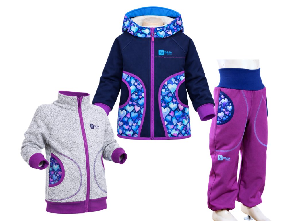 je ušitá ze zimního softshellu (rub-fleece). Horní část kapuce je vystužená, takže krásně drží tvar a slouží jako kšiltík. Na zádech má bunda nažehlený reflexní obrázek.