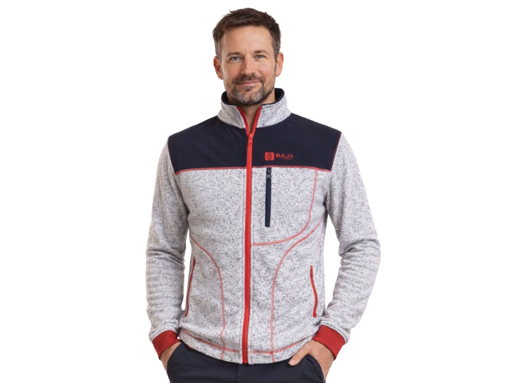 Pánská mikina je ušitá ze svetroviny v kombinaci se softshellem, který kryje ramena. Mikina má dvě velké kapsy.