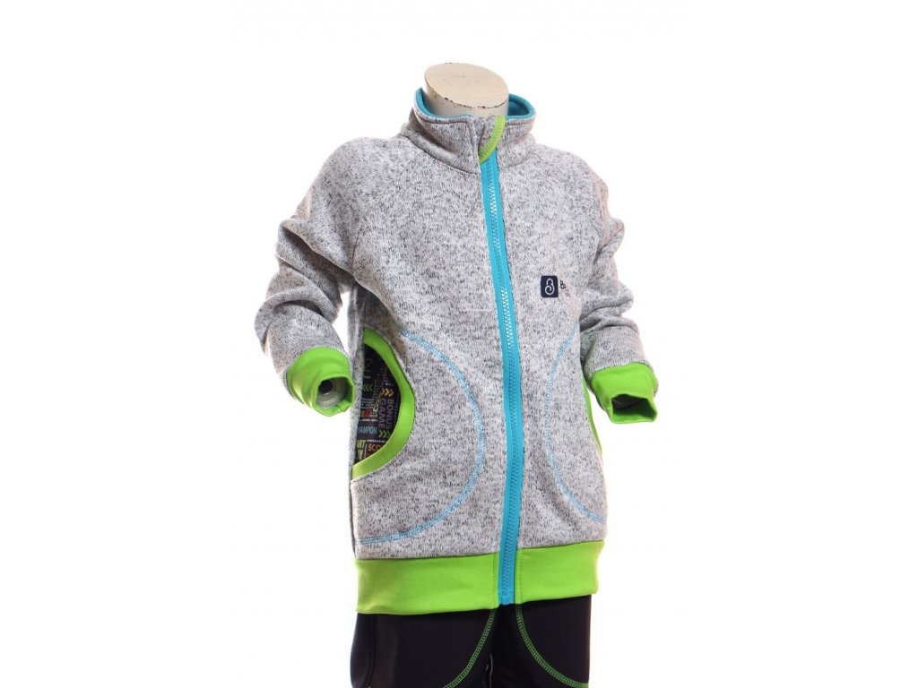 Celopropínací mikina pro kluky je ušitá z fleecové svetroviny. Na lemování se snažíme použít vždy kontrastní barvu, tím je svetýrek originálnější a výraznější. Zip má u krku praktickou krytku, aby neškrábal... K ukončení rukávů používáme patent, díky kterému rukávky nepřepadávají přes zápěstí.