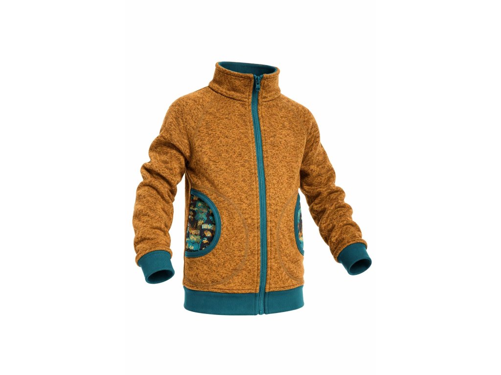 je ušitá z fleecové svetroviny hořčicové barvy. Na lemování se snažíme použít vždy kontrastní barvu, tím je svetýrek originálnější a výraznější. Zip má u krku praktickou krytku, aby neškrábal... K ukončení rukávů používáme patent, díky kterému rukávky nepřepadávají přes zápěstí.